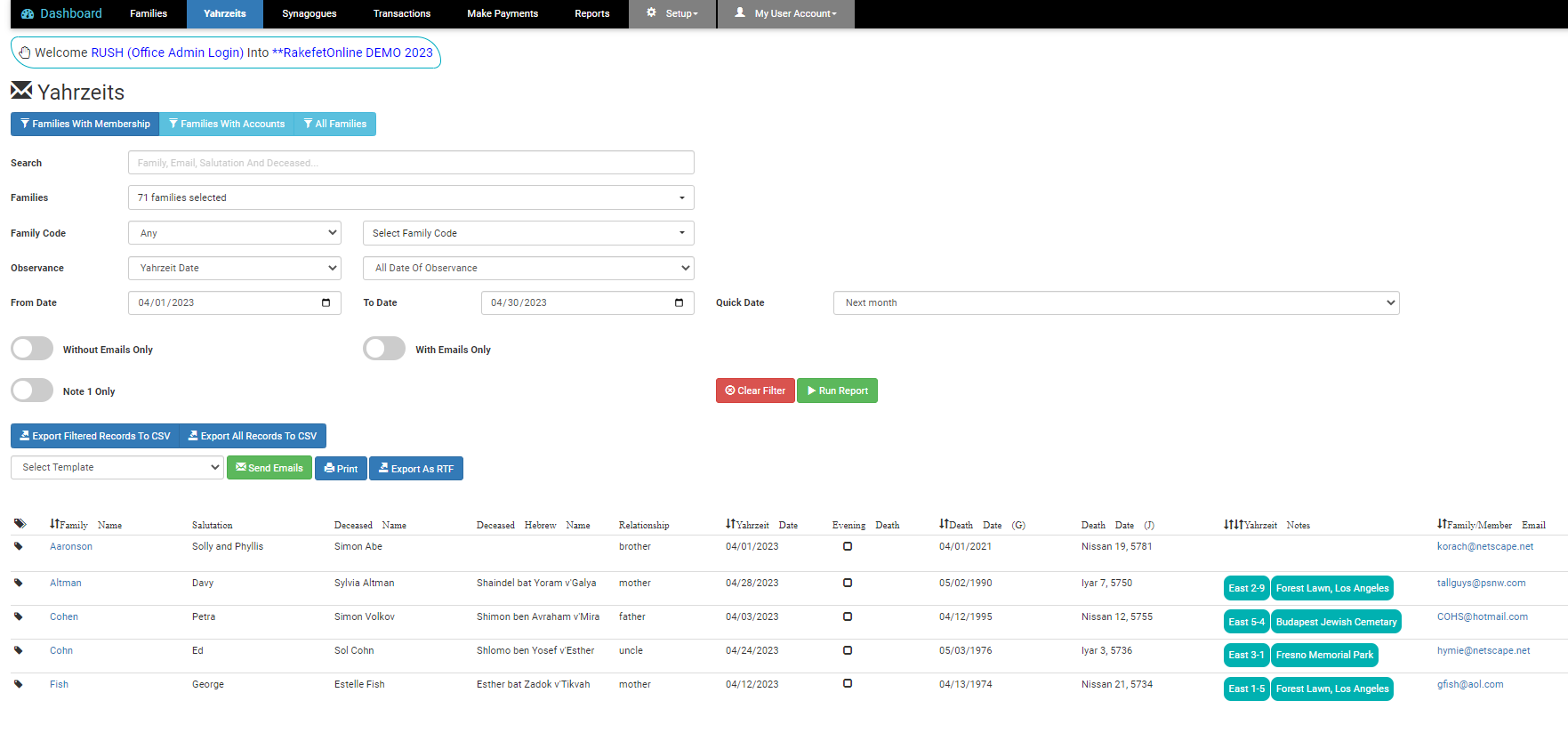 You can filter by Yahrzeit date or death date, Jewish or English observance, all mourners (plus Family / Individual Code), with / without email, Note 1 and search by mourner name, deceased name and email address.