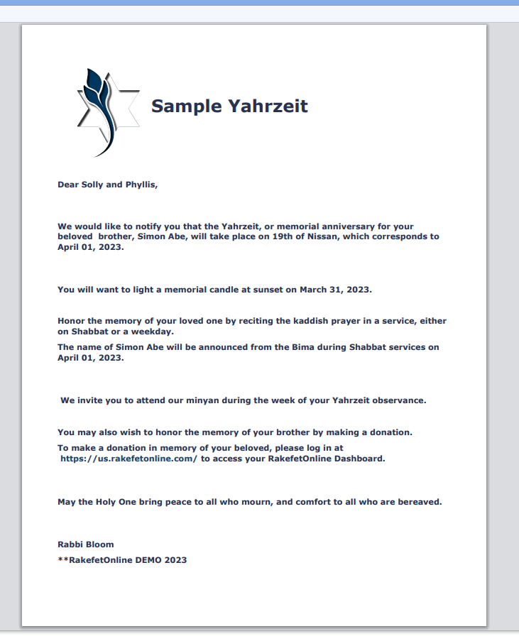 Printed Yahrzeit notices will be available to print through your browser. If you have popup blocker, Rakefet will warn you so you can turn it off.